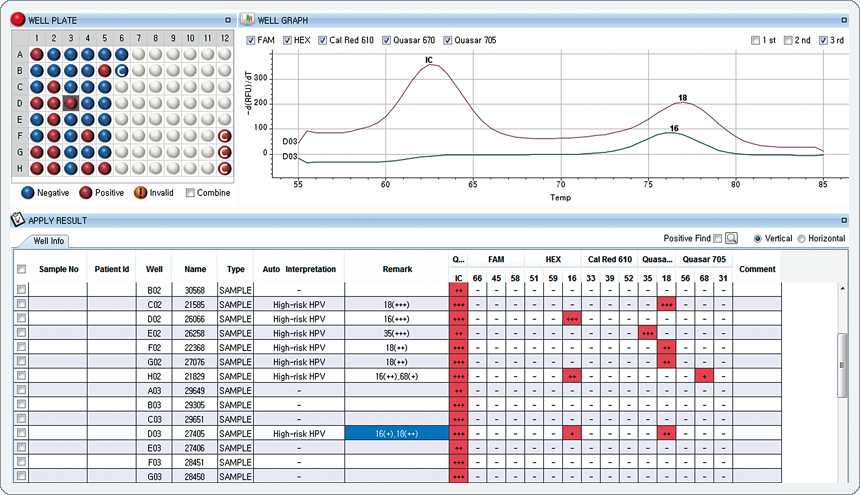 이 결과는 HEX 채널에서 HPV 16이 적은(+)양으로, Quarsar 670채널에서 HPV 18이 중간(++양으로 중복 감염 결과를 보여준다.