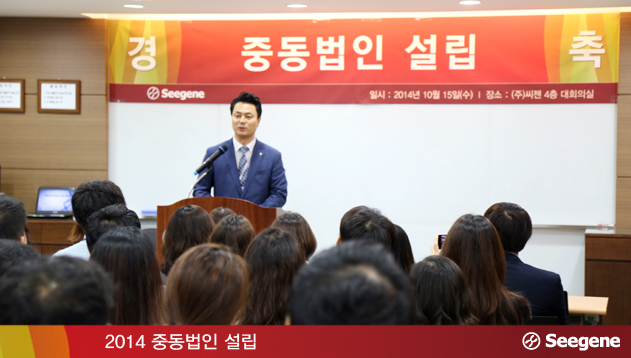2014년?10월 15일?씨젠의 중동법인 출범식이 있었다. 지난 1월 이탈리아를 현지 법인을 비롯하여 해외 법인 진출에?시동을 걸고 있는 시점에서 의료 시장에서도 진출 성공 사례가 많이 생기며 이슈로 떠오르는?지역인 중동 지역에?씨젠도 출사표를 낸 것이다.?
