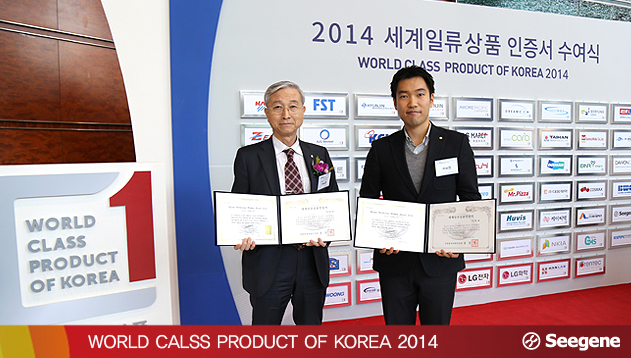 산업통상자원부는 지난 8일 서울 코엑스에서 '2014년 세계일류상품’으로 68개사의 59개 품목을 올해 세계일류 업체와 상품으로 선정했다. (주)씨젠의 호흡기질환 유전자 검사 제품은 세계시장점유율 3위를 달성하여 5년만인 ’14년 현재일류상품으로 승격 되었으며, 추가로 ‘성매개 감염성 질환 진단제품’의 차세대일류상품 및 생산기업으로 선정돼 세계시장을 공략하고 있다.