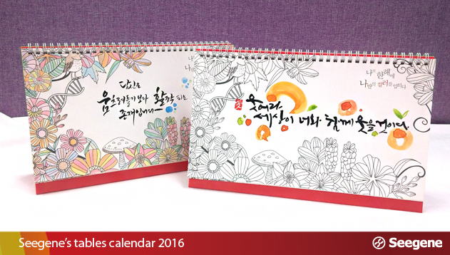 특별히 씨젠 달력에서는?트랜드하게 떠오르는 컬러링 테라피를 적용한 힐링 페이지를 삽입하였다. 스케치 되어 있는 도안에 집중하여 색칠하다 보면 명상의 효과를 얻을 수 있고 이런 힐링 컨셉에 더하여 나의 좌우명과 각오를 적어 일 년 내내 삶의 위로와 힘이 될 수 있도록 기획되었다. 올해 11월부터 쓸 수 있도록 14개월로 구성되어 있어 내년까지 기다릴 필요 없이 바로 교체할 수 있도록 한 것도 씨젠 탁상 달력만의 매력이다.?