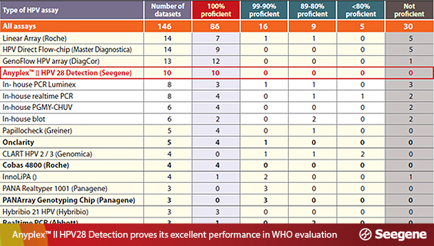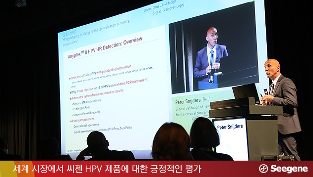한편으로 씨젠의 HPV 제품들은 세계무대에서도 그 우수성을 확인하는 발표가 잇따라 이어지고 있다. 지난 4월 네덜란드의 저명한 병리학자 크리스 메이어 박사 연구팀은 2015 유럽임상미생물 및 감염질환 국제 심포지엄에서 씨젠 HPV 검사제품이 자궁경부암 검사를 환자가 아닌 일반인 대상의 선별검사에 사용 가능함을 입증하는 연구결과를 발표한 바 있었으며, 포르투갈에서 현재 개최 중인 HPV 국제학회(2015 HPV congress)에서는 씨젠 HPV 검사제품이 세계의 경쟁사 제품들과 비교하여 가장 우수한 성능을 보인다는 것이 발표되었다. 본 연구결과는 WHO 정도관리물질을 관리하는 스웨덴의 연구팀 HPV랩넷(HPV Laboratory Network)에 의해 발표되었다.